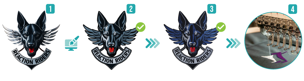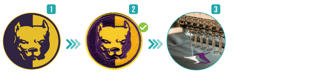 For minor modifications (or if the file is already correct), our workshop intervenes directly, at no extra cost. Once you upload your file (1) you will receive a photographic sample of your patch (2)  to approve before proceeding with production (3).