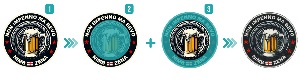 If you want to keep the original design (1), sublimation printing is the ideal solution: it faithfully reproduces your design without compromise. The file does not need to be modified and is transferred exactly onto the patch. You can choose the shape – round, square or custom – without converting the file into a specific format for embroidered patches.